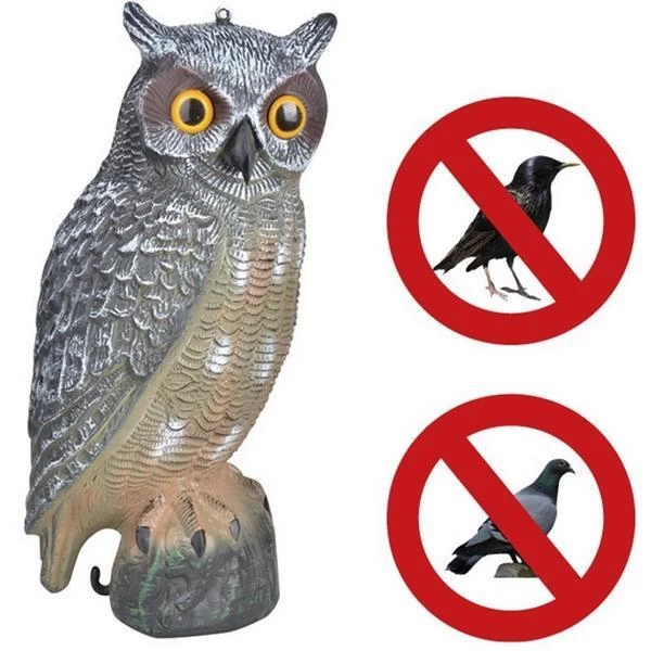Kleine vogels die zich voederen met groente-, bloemen- of graszaden worden afgeschrikt door de aanwezigheid van de vogelverschrikker in de vorm van een uil.