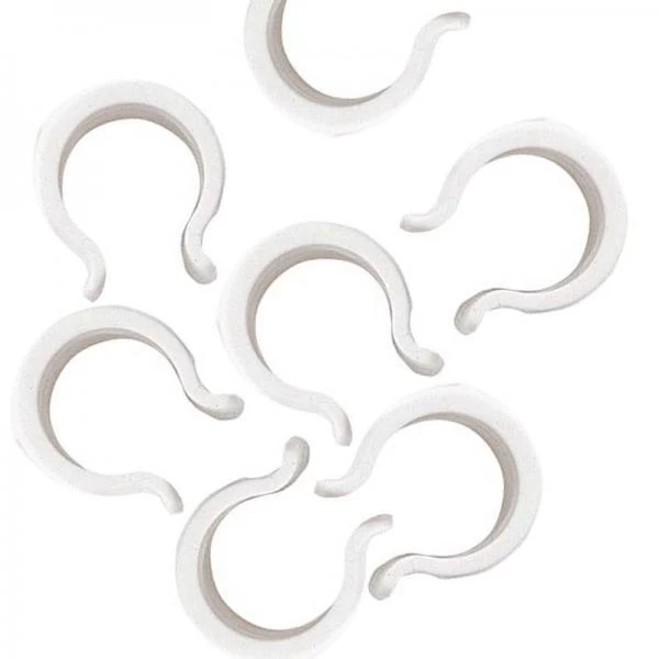 Stevige kunststof klemmen voor het vastzetten van folie, insectengaas, weringsnet of zeil aan buisvormige structuren.