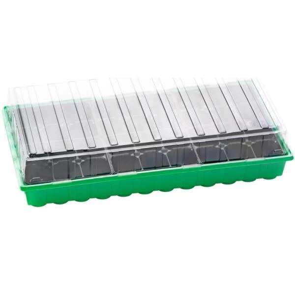 Deze handige kweekset bestaat uit 6 losse trays van 6 vierkante potjes, elk potje is 6 cm breed. Onder het transparante deksel ontstaat het perfecte opkweekklimaat voor de groei van groenten, kruiden, bloemen en andere planten. De groene onderschaal is voorzien van sleuven voor een optimale watervoorziening.