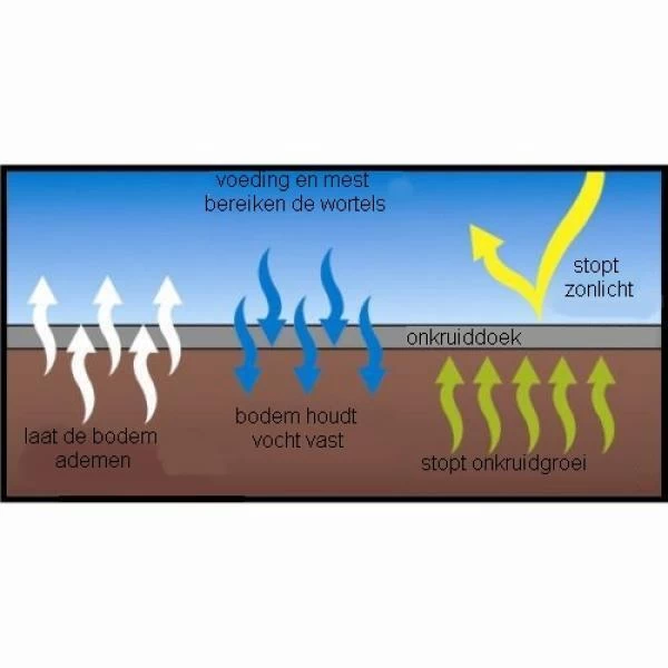 Het doek zorgt ervoor dat er geen onkruid te voorschijn komt tussen de gewassen. Eenvoudig aan te wenden voor vele teelten of borders. Geschikt voor allerlei planten, bloemen en groenten. Bijvoorbeeld bij het aanplanten van heggen, struiken en bomen, bloemborders, aardbeibedden, rotstuintjes,…